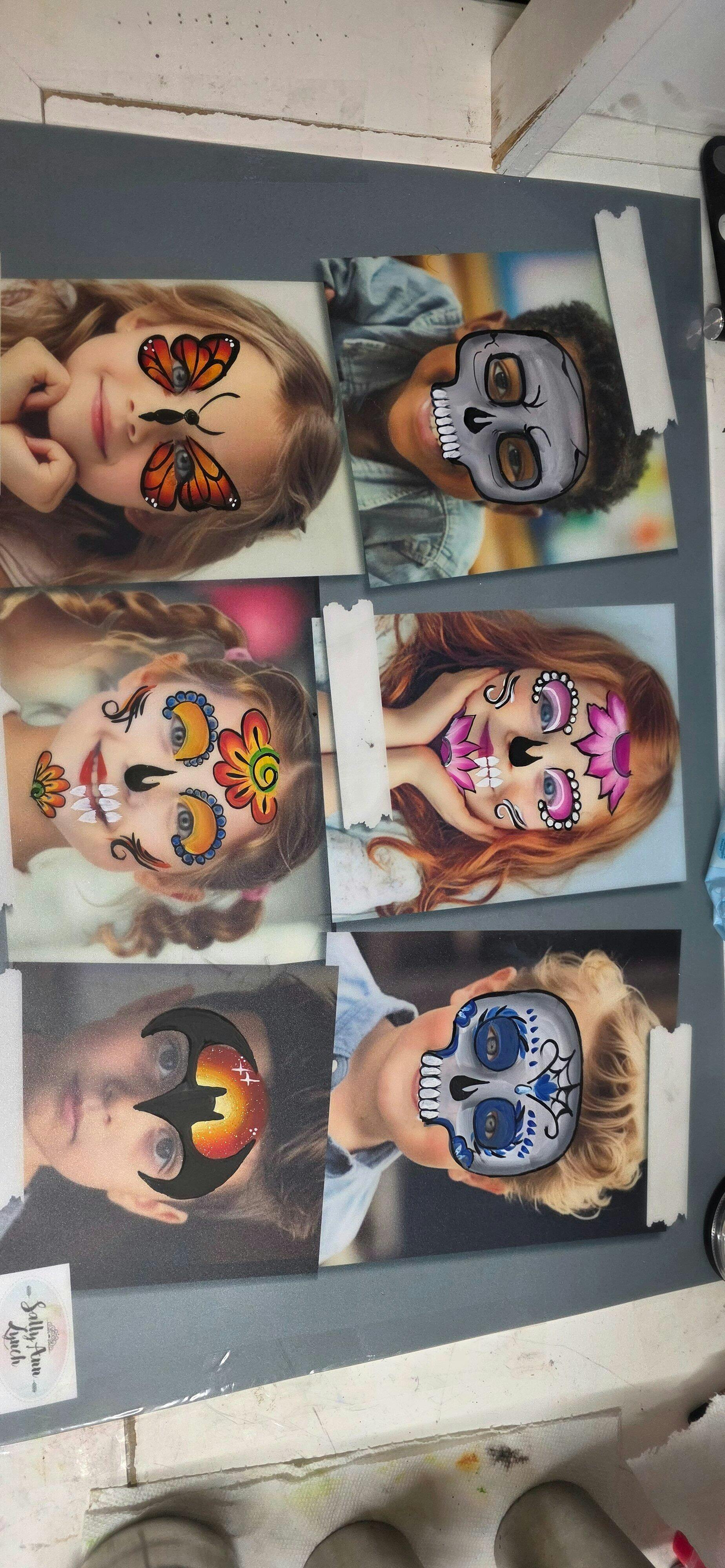 Our lovely full colour boards are made up from the faces on our individual Realistic practice and display boards. They are the children of other face painters and my son Jonnie is on one of them.